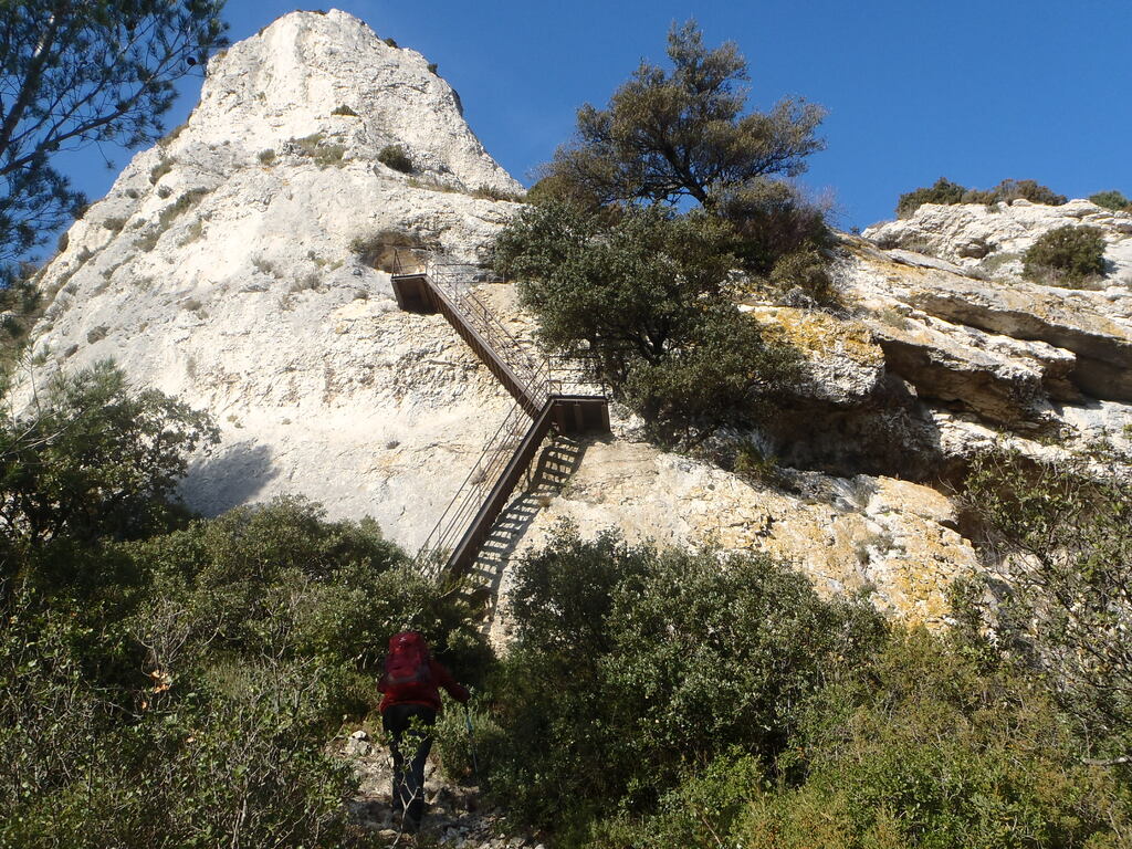 Deux échelles pentues à monter et une à descendre, et deux sentiers en balcon avec mains courantes sur le Mont Gaussier; sentier à sangliers en montée raide pour accéder au Plateau de la Caume, et Pas de l'Aigle sur la crête où on met les mains; montée de la Grotte Cheminée après le barrage des Peirou, avec barreaux et chaînes, puis descente raide .